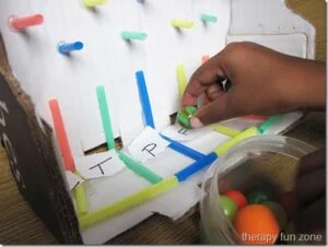 This game was a lot of fun and worked on a lot of different skills. There was a lot of relay practice, finger strengthening when using the crazy cubes, visual-motor coordination when watching the ball go down the Plinko board, and fine motor skills when writing the required word. It was an excellent activity that I intend to repeat often. I did it again with another student and, since I forgot the crazy cubes, we used marbles. We managed to work most of the skills, although the crazy cubes add an extra layer of fun and challenge.